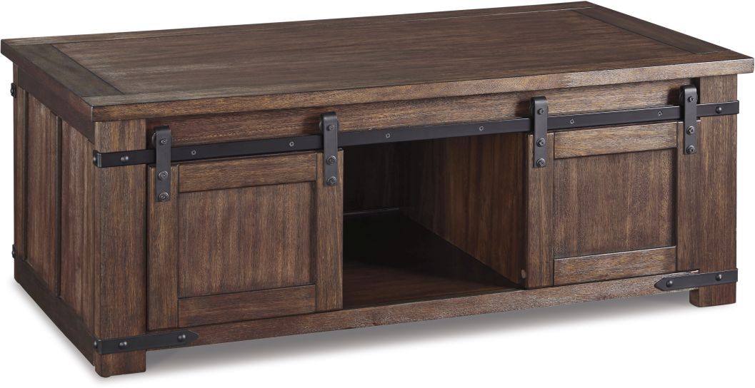 Attractive barn-style sliding doors give this Budmore cocktail table discreet storage. With the convenience of casters, you can effortlessly place this table wherever you fancy.