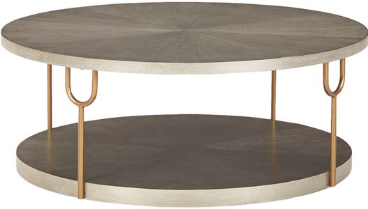 Contemporary design. With the addition of a striking accent piece, one can take any room from ordinary to extraordinary. And the Ranoka round coffee table has just what it takes to elevate your home's decor to astonishing new heights. Made with wood veneer in a warm metallic silvertone finish and complemented by metal tubular legs, its artful composition and spartan design mesh seamlessly into any modern living space.Read More